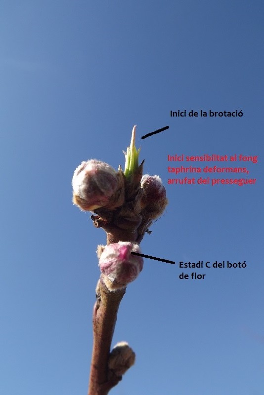 L’ arrufat del presseguers ( Taphrina deformans) és una de les malures més habituals d’aquest fruiter d’ós. La solució no és complicada, es tracta de prevenir l’atac del fong coneixent el moment de risc. A mitjans de febrer quan les varietats de presseguers inicien la brotació en verd i el botó de flor està inflat i comença també a obri-se, és quan hi ha més sensibilitat a aquest fong. Però el desencadenant de la infecció és una pluja o unes humitats molt elevades. Per tant ara és el moment de fer algun tractament per evitar el desenvolupament del fong. Evitar la proliferació d’aquest fong en aquests moments és bàsic per no tenir una infecció que la faci irreversible.